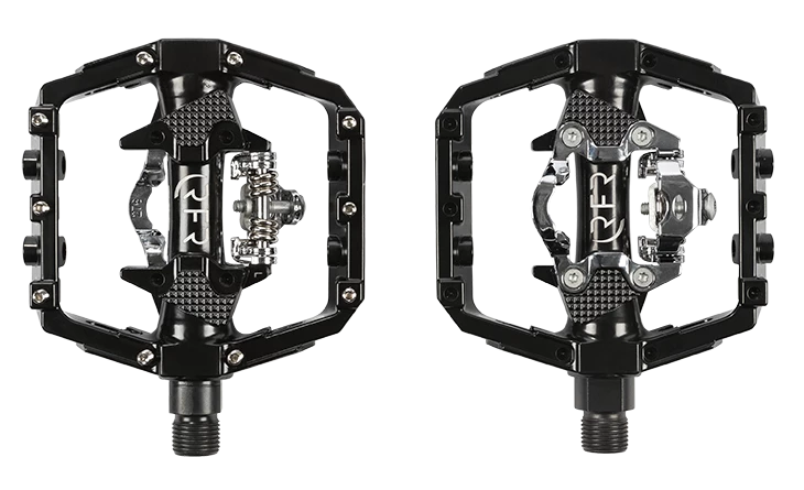 Das Flat-Pedal mit Klick System ist SPD kompatibel und wird auf einer CrMo-Achse verbaut. Die Anti-Rutsch-Pins sind austauschbar und bieten besten Halt am Fahrrad.