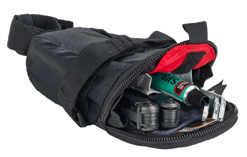 Für Minimalisten. Die ultraleichte Satteltasche im mittleren Format bietet mit zwei kleinen Innentaschen Platz für Dein Notfallset.