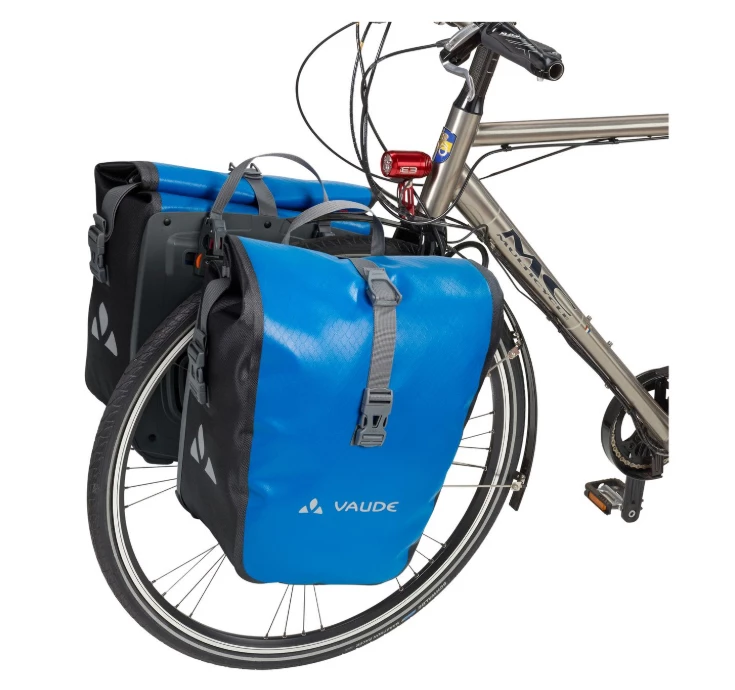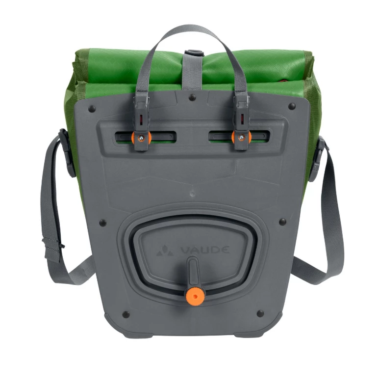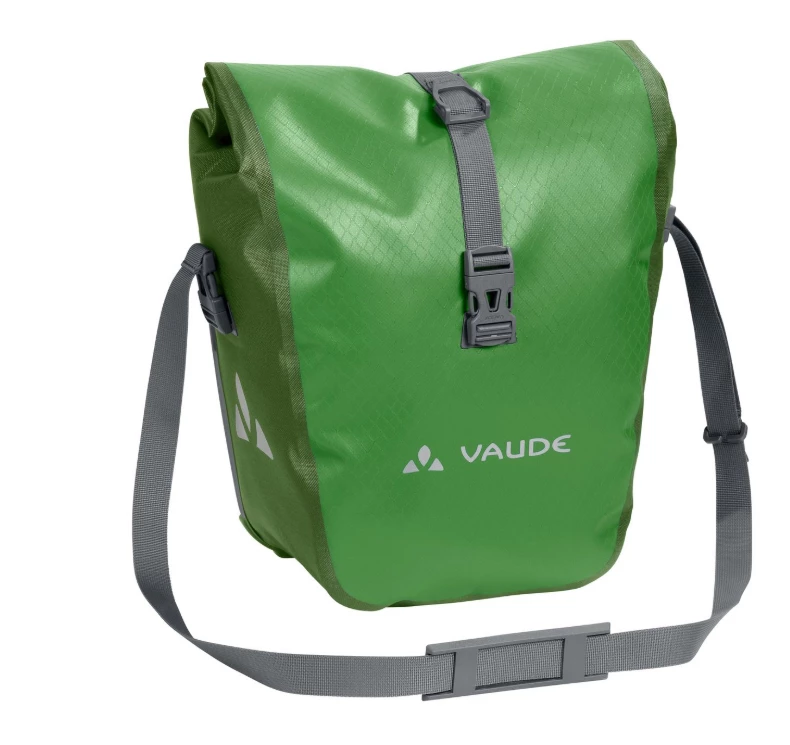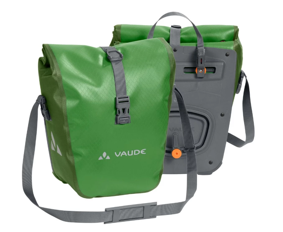 Auf in die große, weite Welt! Die wasserdichten Vorderradtaschen werden aus robustem, PVC-freiem Planenmaterial klimaneutral am deutschen VAUDE-Standort in der Nähe des Bodensees hergestellt und würden gerne mit Dir auf große Reisen gehen. Sie lassen sich durch den Wickelverschluss auf individuelle Größen bringen und absolut dicht verschließen. Für Übersichtlichkeit sorgt eine extra Innentasche. Die Taschen werden mit dem QMR 2.0-System und stabiler Rückenplatte rechts und links am Gepäckträger befestigt, sind über einfach bedienbare Handrädchen justierbar und lassen sich schnell und einfach abnehmen. Diese Vorderradtaschen können genauso gut als Hinterradtaschen verwendet werden. Mit einem Fahrradschloss können sie direkt am QMR-Haken verriegelt werden. Mit Reflexelementen. Lieferumfang: zwei Taschen (Paar). Das Gesamtvolumen beider Taschen beträgt 28 Liter. Kann durch diese praktische Zubehör-Taschen ergänzt werden: Toolbag Front, Addita Bag.
